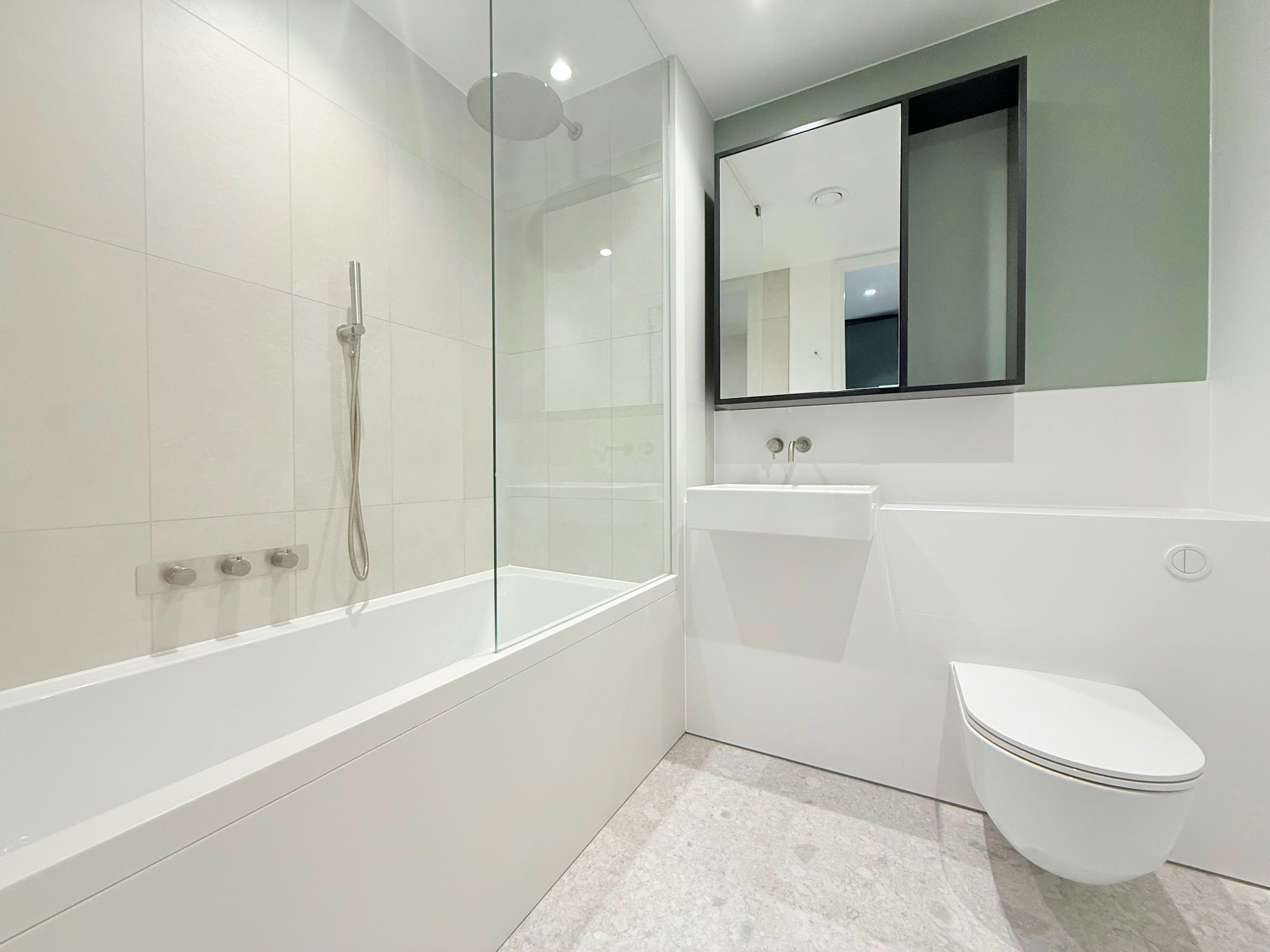 Designed by Knight Dragon Interior Design, the apartments reflect the natural surroundings with calming, earthy tones and warm textures. Bedrooms are styled for comfort and relaxation, while bathrooms feature sleek white finishes, mirrored cabinetry, and elegant off-white porcelain floor tiles for a refined touch.